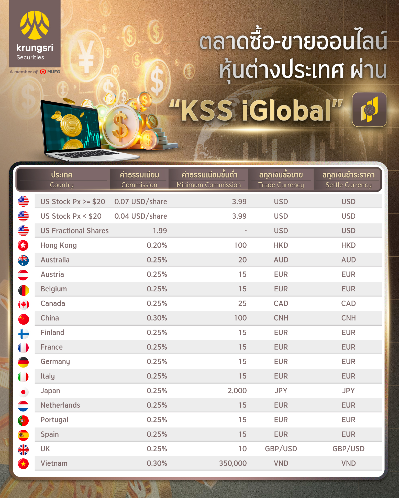 - สำหรับการซื้อขายหุ้นต่างประเทศไม่มีขั้นต่ำในการลงทุน แต่บริษัทฯจะมีการคิดค่าคอมมิชชั่นขั้นต่ำ