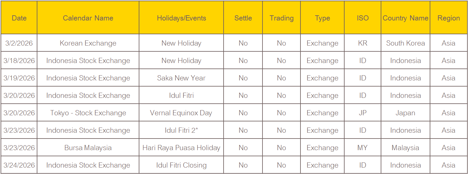 ตารางวันหยุดทำการตลาดต่างประเทศของ Krungsri Securities iGlobal